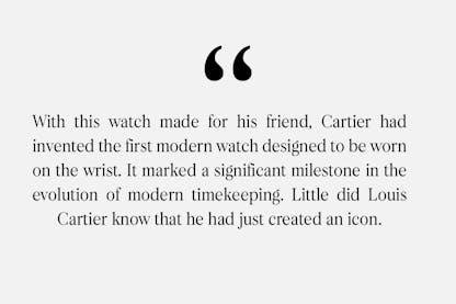 The new robust timepiece was square in shape, with a thick bezel affixed with visible screws. Cartier fitted the watch with a leather strap that secured it firmly to the aviator’s wrist. Large Roman numerals on the watch’s dial made for easy readability, and its sturdy case provided durable protection for the hand wound movement, which in turn provided reliable and stable timekeeping. With this watch made for his friend, Cartier had invented the first modern watch designed to be worn on the wrist. It marked a significant milestone in the evolution of modern timekeeping. Little did Louis Cartier know that he had just created an icon.