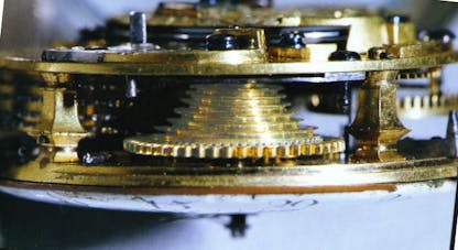 In the 15th century, springs were introduced to power clocks, enabling the creation of smaller designs. However, these early spring-driven clocks were notably less precise than their weight-driven counterparts. While a suspended weight provides a steady force to drive the clock’s gears, the force from a spring decreases as it unwinds. This led to smaller clocks, which was a plus, but also dramatically less accurate.