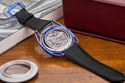 The case has double floating lugs in blued titanium, and although the ogival lugs are diminished they’re still very much present.