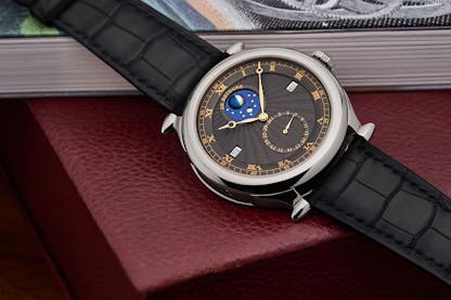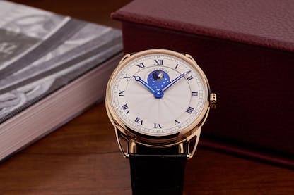 All of De Bethune’s most important innovations are visible, including the triple pare-chute system, spherical moonphase, and self-centering flat balance spring, and the balance itself is a real piece of horological exotica – it’s a solid disk of pure silicon crystal, with a rim of palladium. The design is almost completely free of aerodynamic drag, and the design places the majority of the mass of the balance on the rim, where it needs to be in order to enable the balance to better resist changes in rate during movement of the watch.