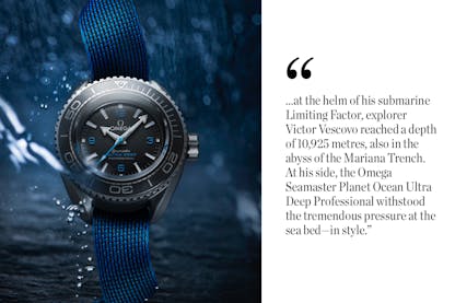 Rolex clocked up a large number of records. In 1960, in the Pacific Ocean, the bathyscaphe Trieste descended to a depth of 10,916 metres in the Mariana Trench, the deepest part of the world’s oceans. An experimental Rolex, the Deep Sea Special, was fitted to the outside of the hull – and remained undamaged by the colossal pressure of over one tonne per square centimetre. When the bathyscaphe returned to the surface, the watch was still displaying the correct time, proving that it had continued working throughout the dive. Omega followed in 2019, going deeper still: at the helm of his submarine Limiting Factor, explorer Victor Vescovo reached a depth of 10,925 metres, also in the abyss of the Mariana Trench. At his side, the Omega Seamaster Planet Ocean Ultra Deep Professional withstood the tremendous pressure at the sea bed – in style.