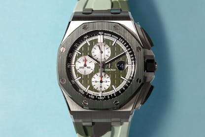 Having referenced the legend earlier, a current Audemars Piguet reference obviously had to make this list. This 2019 reference has the upsized 44mm case, a green ceramic bezel, and a unique matching camo rubber strap. These broad pusher references sway a touch from the original Offshore design, and the tradeoff of this design cue is a slight drop in water resistance; these models boast 100m of water resistance, compared to the 200m resistance of the original reference. Its caliber 3126/3840 automatic movement is good for a power reserve of 50 hours, and is relatively compact even though the hefty Offshore measures 14.4mm thick.