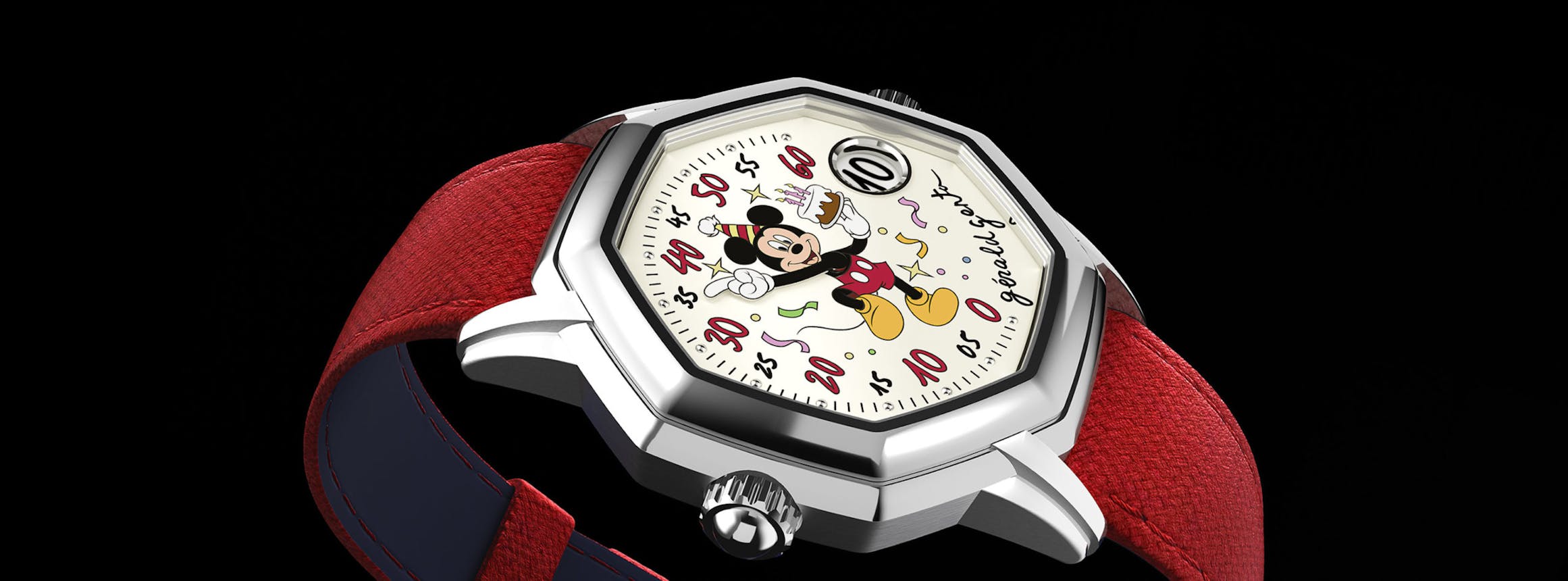 The Gérald Genta Only Watch 2023, retrograde minute, jump hour and repeater with Mickey Mouse. Case, white gold, 40mm x 10.96mm; 50 meter water resistance. Champlevé enamel dial created by Nicolas Double at Manufacture La Fabrique du Temps. Movement, caliber GG=001, running at 3Hz in 44 jewels with 80 hour power reserve, developed and made in-house at La Fabrique du Temps; two-hammer minute repeater with centrifugal regulator in octagonal housing. Red rubber strap and white gold tang buckle. Unique piece celebrating the 100th anniversary of the Walt Disney company and the 10th anniversary of Only Watch, to be auctioned at Only Watch 2023 on November 5th. All appearances of Mickey Mouse©, courtesy Disney Inc.