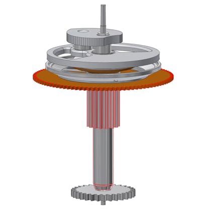 In this picture, everything you see outlined in red is turning as long as the watch is running, including the large upper wheel which is the movement fourth wheel. The vertical clutch is on top and at the very top of the whole assembly is the return to zero heart cam. Above the heart cam is the pivot for the actual seconds hand, and you can see the upper side of the entire assembly through the open dial of the watch.