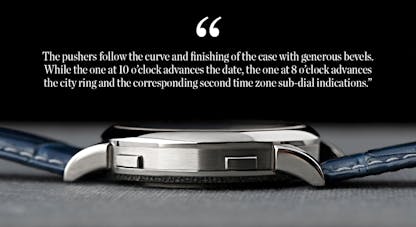 The pushers follow the curve and finishing of the case with generous bevels. While the one at 10 o’clock advances the date, the one at 8 o’clock advances the city ring and the corresponding second time zone sub-dial indications.