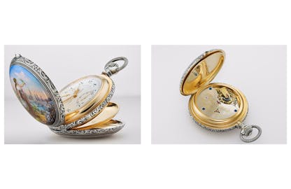It took decades, numerous trials and patents for the watchmakers and artisans from Glashütte to come up with what we can call a mature work. (You can read more about it at, here) Finally, around the 1870s, the hallmark design emerged. On the dial side, it would feature Arabic Numerals, a rail-way minute track, stunning hands, three-dots on each quarter inspired from the Saxon porcelains, and a multi-layered dial. Turning the pocket watch and opening the cover would reveal the classic Glashütte movement: a three-quarter plate, hand-engraved balance cock, blued screws, and famous gold chatons.