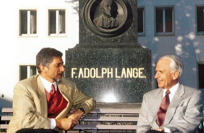 Walter Lange and Günter Blümlein in front of F. Adolph Lange’s statue in Glashütte. Credit Lange Uhren GMBH