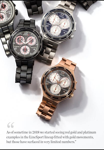 Though things switched to titanium in 2014, the aluminum movements carried forward in all titanium examples through to present day. As of sometime in 2018 we started seeing red gold and platinum examples in the LineSport lineup fitted with gold movements, but those have surfaced in very limited numbers.