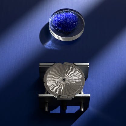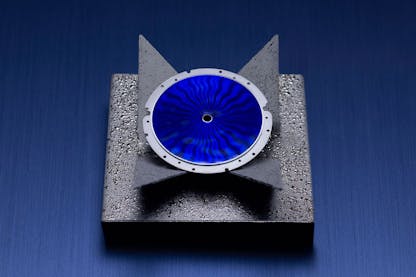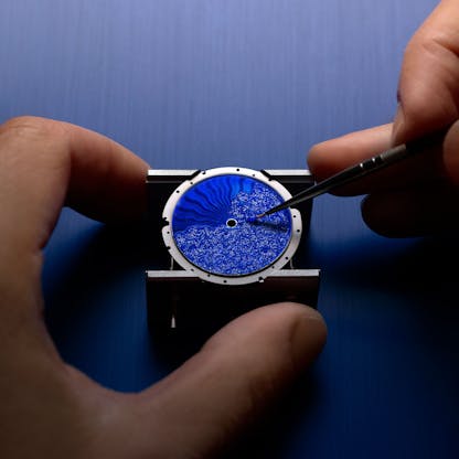 Once the pattern’s engraved, the enamelist fills the recess with powdered blue enamel, which is then fired. The vitrified enamel forms a translucent layer over the guilloché pattern.