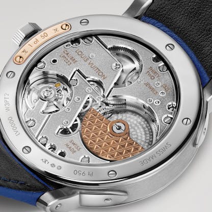 The platinum case and rehaut are offset by small blue beads for the hour markers, with two each on the applied dial markers at the quarters, whose shapes are derived from LV trunk brackets. The inner part of the dial has a shallow recess in which a guilloché pattern has been engraved – the operation of engraving is more demanding than usual, LV says, as the cutting head of the rose engine has to be guided right up to the lip of the recess.