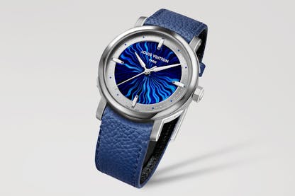 The Louis Vuitton Escale Platinum Guilloché: case, 950 platinum, 39mm x 8.97 without domed crystal; 10.34mm with crystal; sapphire crystals front and back; water resistant to 50 meters. Dial, grand feu enamel over hand-applied guilloché on white gold plate. Movement, cal. LFT023, micro-rotor automatic with 22k rose gold winding mass; running at 28,800 vph in 32 jewels; chronometer certified by the Geneva Observatory. Blue calf leather strap with platinum pin buckle. Price, $68,000; limited edition of 50 pieces. See the Escale Collection at LouisVuitton.com.