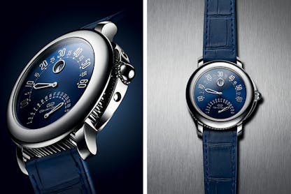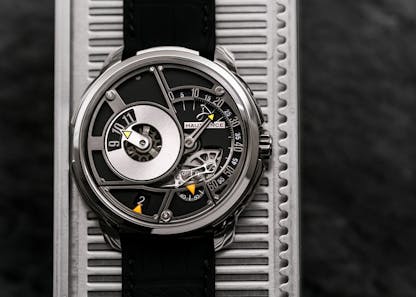 The Vagabondage series, whose first iteration arrived in 2004, followed by the second in 2010, and the third in 2017, all play with the idea of jumping time displays in different ways. With the first, the focus was the hours, using a revolving disc that managed to indicate both hours and minutes in a single construct. The overlaid ‘frame’ indicated the hours and would jump from one position on the disc to the next at the top of the hour, while the disc itself rotated slowly to indicate minutes. In its second guise, we were treated to a time display similar to the Zeitwerk and Pallweber. In its most recent form, the Vagabondage III, we instead see what was then also a first for the industry. Minutes moved back to a singular hand display, but for the first time we saw jumping seconds. This is quite a challenge to execute, as was reflected by the piece’s modest 38h power reserve (when Journe often does 5-days). That said, it’s an absolutely stunning watch with an open-worked dial that is all too easy to get lost staring into.
