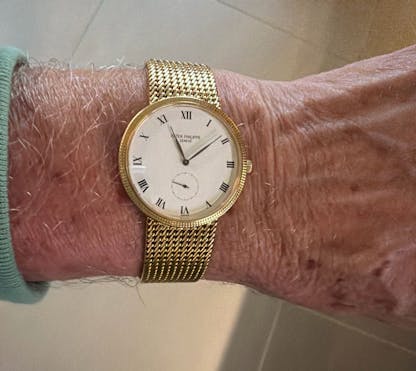 That shift found its visual anchor in the Calatrava reference 3919. With its hobnail, or Clous de Paris, bezel, Roman numeral dial, time only layout, and straight lugs, the watch became the archetypal Patek Philippe in the public imagination. While it was not the first Patek to feature the hobnail bezel – that distinction belongs to the reference 3520 – the design is now almost inseparable from the 3919 itself. It was this watch that anchored Patek Philippe’s first global advertising campaign and gave the brand a recognizable face during a pivotal moment in its history.