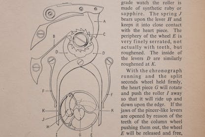 This is from Donald de Carle’s “Complicated Watches And Their Repair.” When the split button is pushed, the column wheel rotates allowing the jaws of the two pincers D to drop onto the split seconds wheel E under the pressure of the two springs, F. This stops the wheel, thereby freezing the split hand in place. The heart piece G, which is on the axis of the still-running chronograph seconds hand, continues to turn and as it does the lever H, with its ruby roller I, rides up and down the edge of the heart piece. Push the split seconds button again and the column wheel turns, lifting the clamps off the wheel. With the pressure released, the ruby roller I presses against the heart piece under the pressure of the very fine spring J, and the split seconds wheel E to which it is attached, turns until the ruby roller comes to rest on the lowest point of the heart piece, at which point the split hand and chronograph seconds hand are aligned and running together again.