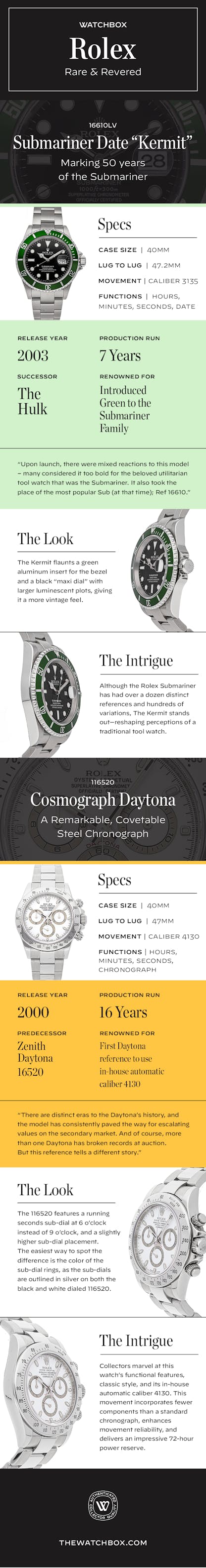 Discover two of the most sought after Rolex sport models: the Submariner 16610LV and the Daytona 116520. The Submariner offers a high water resistance while the Daytona easily times events using the chronograph. Learn more about these two models and what makes them unique including sizing specs, nicknames and production years.