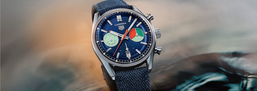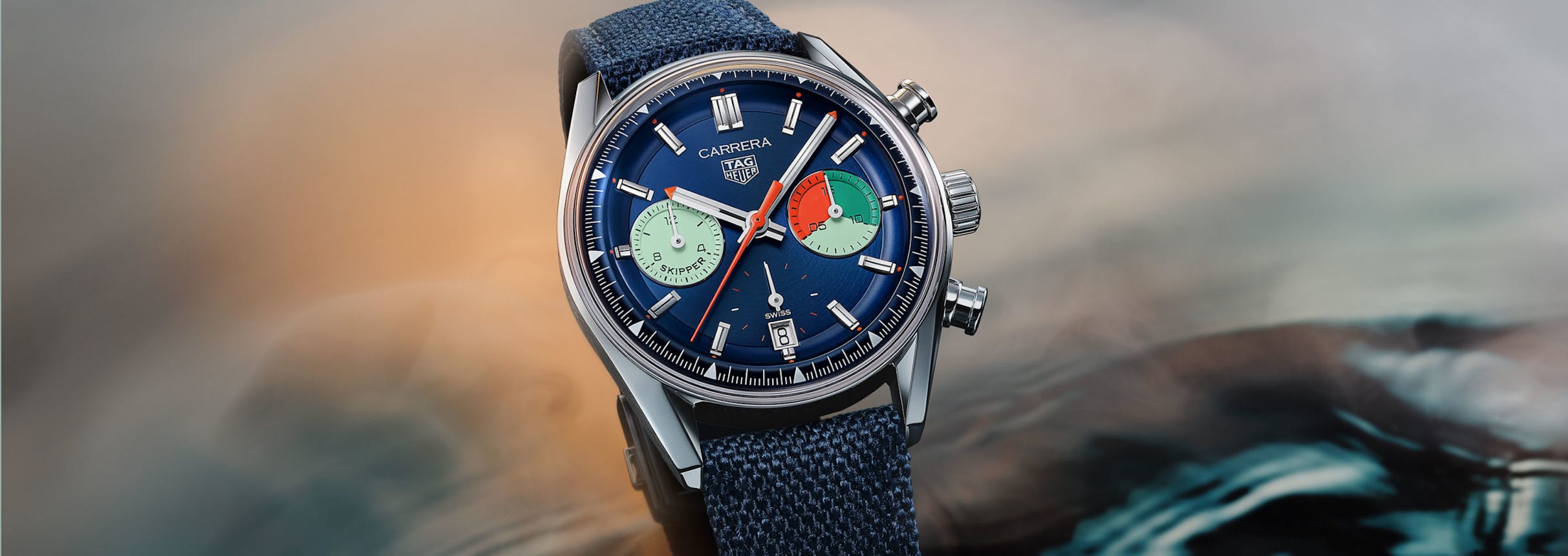 The TAG Heuer Skipper: Case, 39mm x 13.9mm, 46.0mm lug to lug, “bezel free construction” with glassbox domed sapphire crystal; water resistance 100 meters. Movement, caliber TH20-06, automatic, with regatta countdown chronograph and center seconds chronograph register, with hour counter at 9:00. Estimated MSRP, CHF 6,600. The 1916 Company is an Authorized TAG Heuer Retailer.