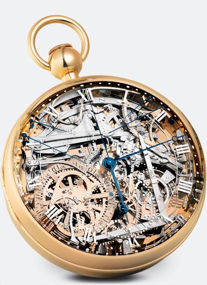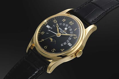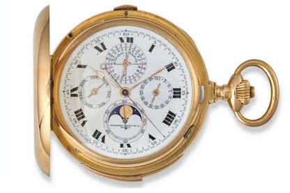 Perpetual calendars in complicated pocket watches generally followed the format seen in watches like this Audemars Piguet grand complication, perpetual calendar, minute repeater, and chronograph pocket watch, completed in 1908 and sold at Christie’s in 2018.