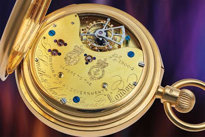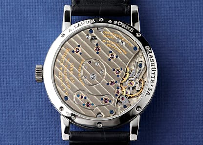 Similarly, Lange refers to its calibers with a separate escape wheel cock as 3/4 plate movements. In both instances, from an aesthetics standpoint, you are getting a design chosen as much for its historical antecedents as anything else; Smith is working in the English hand-made, high grade pocket watch tradition (with the elaborate engraving on the crown and ratchet wheel cover irresistibly reminiscent of the incredibly intricate engraving on the balance cock of Harrison’s H4 marine chronometer) and in the case of Lange, there’s an intended evocation of the Glashütte pocket watch tradition, further reinforced by all those screwed in chatons, which are also primarily a design rather than a technical decision. In both cases, the makers are connecting the dots between their modern work and the pocket watch world, and specifically seeking to evoke a particular design idiom. And, in both instances, there is a deliberate evocation of a philosophy that underscores the preference for a commitment to precision over the elegant flatness possible with full bridge calibers.
