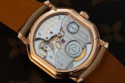 The Daniel Roth Extra Plat caliber DR002 is a hand wound movement with a single bridge for the crown wheel and ratchet wheel/mainspring barrel and center wheel, and a separate bridge for the third, fourth, and escape wheels. It’s not exactly a full bridge movement, but the precise classification matters much less than the specific design decisions that have been made with respect to the shape and arrangement of the bridges and the boundaries between them. I’ve gone into a ton of detail on this aspect of the movement in our Hands On story from last month, but the gist of it is that forms of the components and how they’ve been designed to harmonize visually with each other, rewards very close examination. The fact that the movement is seamlessly integrated visually with the rest of the watch doesn’t hurt one bit either.