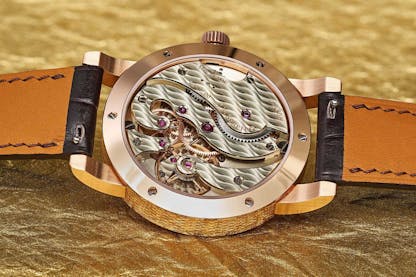 Here the movement design appeals to tradition, but Shapiro clearly wants to put his own stamp on the basic movement layout and that’s clear both in the overall movement design, and in the decision to use a kind of wave-pattern finish on the bridges rather than conventional Geneva stripes. The shape of the center bridge in particular sets this apart from a standard bridge movement, with the loop at the end for the fourth wheel pivot and its jewel lending an almost calligraphic flourish.