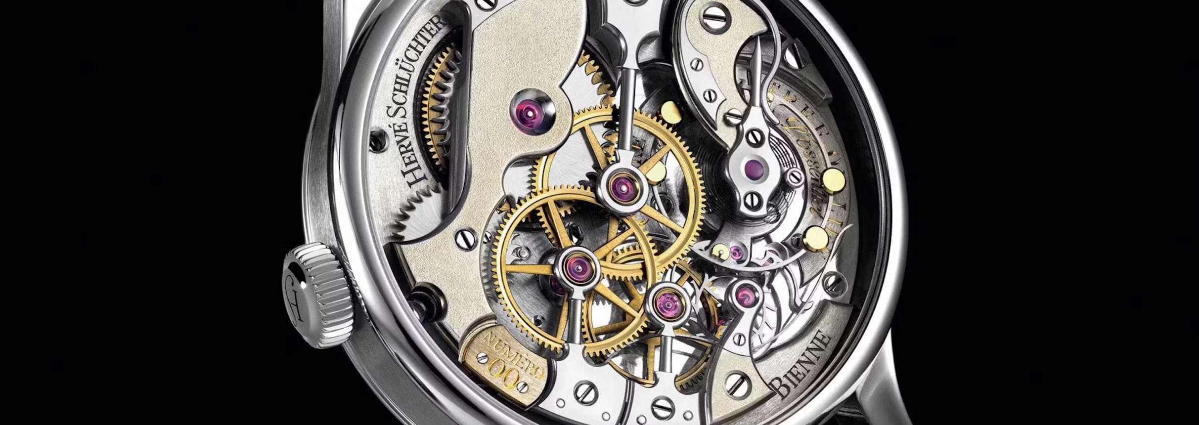 Now this is the Hervé Schlüchter Philosophical Regulator and you don’t need me to notice that this is designed to a totally different philosophy than the DR002 caliber or the Simplicity caliber (Schlüchter studied movement finishing with Philippe Dufour but has obviously struck out on his own where movement layout is concerned). You mightn’t believe it but the basic gear train layout is exactly the same as in the Simplicity and DR002 calibers – there is a crown wheel, mainspring barrel/ratchet wheel, center, third, fourth and escape wheels, and balance at that’s all she wrote – except the actual design is absolutely Rococo in its complexity. The movement has only one actual bridge – for the ratchet wheel/mainspring barrel and the crown wheel – and everything else gets its own cock; if you start trying to count the number of anglaged edges on your fingers or the number of sharp inner corners you’re going to run out of fingers mighty quick. Now this is where matters of taste start to enter the picture – is this sort of deliberately florid complexity designed to showcase the art of hand finishing as an end in itself, simply too much of a good thing? Or does the traditionalism of the DR002 caliber and the Simplicity caliber leave you wanting something more idiosyncratic and overtly dramatic?
