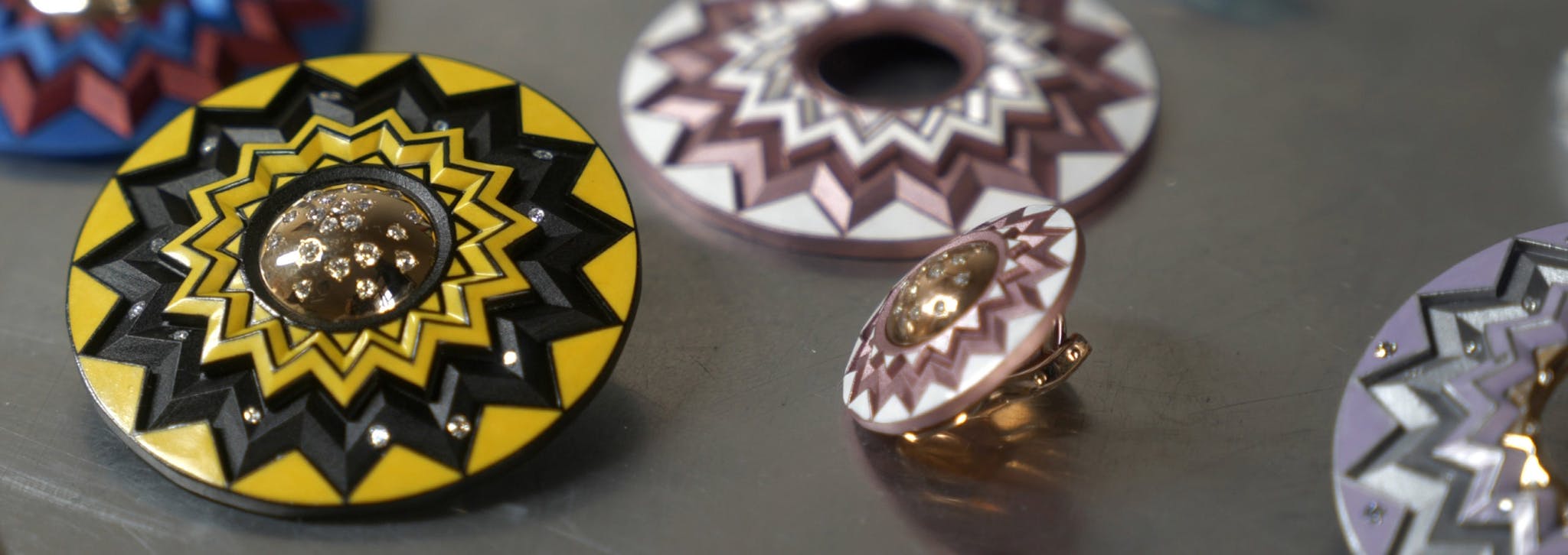 The nearness of these revolutionary creative spirits and their work not only greatly impacted her contemporary art collection; it also proved to be a formidable catalyst for her jewelry creations. Radiant colors, audacious compositions and unusual materials have become trademarks of Suzanne Syz’s work.