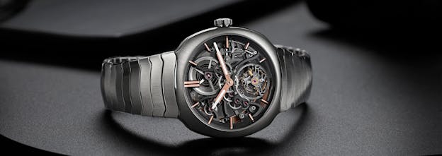 The Moser Streamliner Tourbillon Skeleton: Case, steel, 40.0mm x 10.3mm (12.1mm with domed sapphire crystal) with sapphire crystal caseback; water resistance 12 atmospheres/120M. Dial, fully skeletonized, 5N gold plated faceted indexes; 5n gold plated hour and minute hands with Globolight inserts. Movement, openworked caliber HMC 814, automatic one minute flying tourbillon with double balance springs, running in 28 jewels at 21,600 vph. Anthracite finish, diamond-bevelling; gold skeletonized oscillating weight. Integrated steel bracelet with folding clasp. Price, CHF 79,000; for more info visit H-Moser.com.