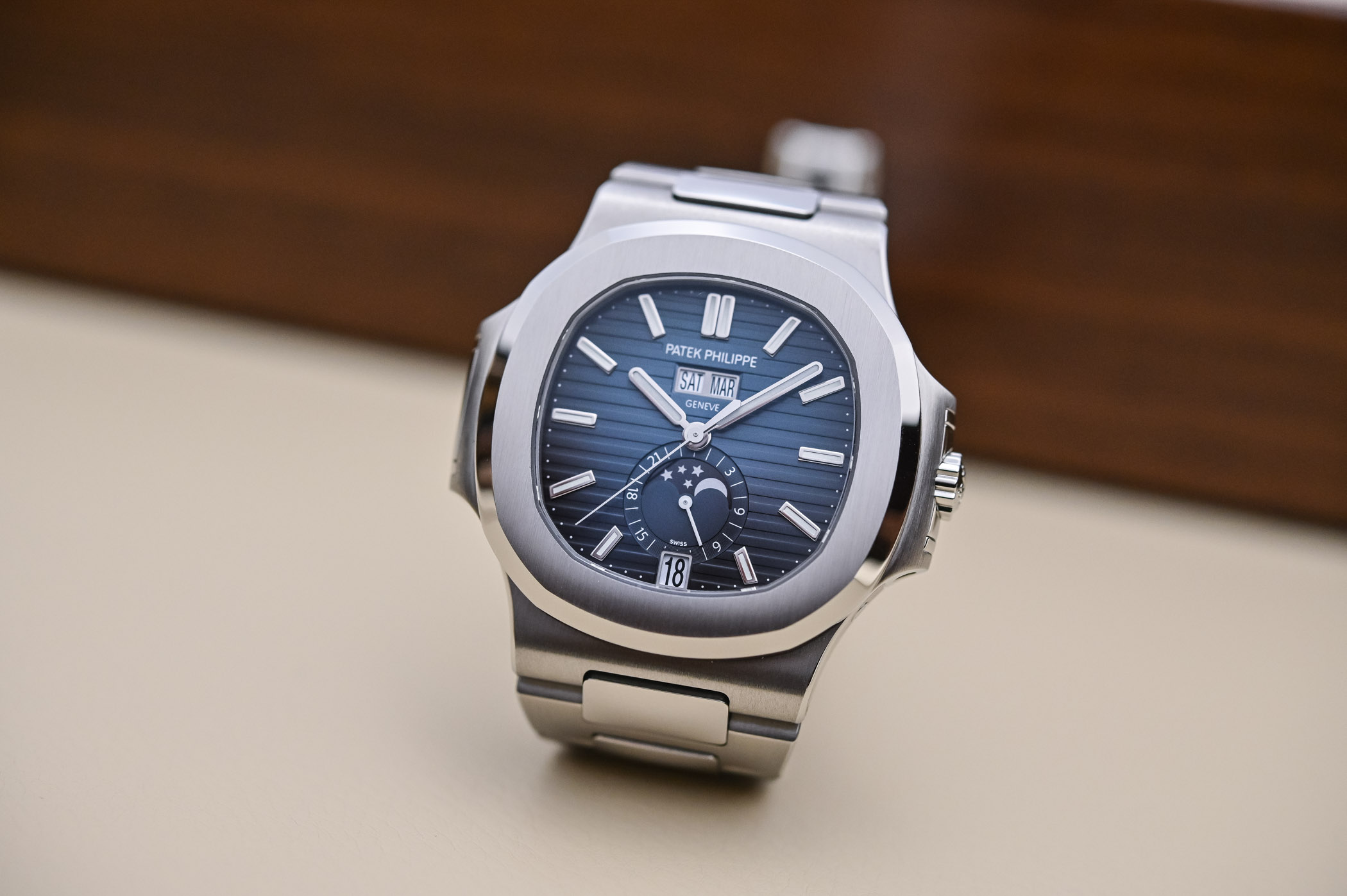 Zoom InPatek Philippe 5726/1A-014. Automatic annual calendar with moonphase in stainless steel. All these differentiating details could be deciphered by the reference number alone. Image: Monochrome