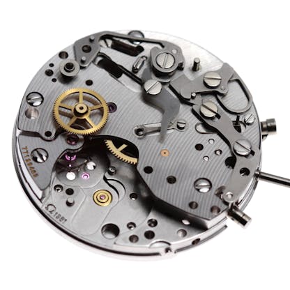 Above is an Omega caliber 1861 with the chronograph train removed; the friction spring is visible at the center of the movement, just under the Delrin (nylon) brake (image is from the Speedmaster deconstruction article on The Naked Watchmaker, which I promise, if you’re a gearhead and don’t know about it already, you will love). You may have heard if you take an interest in these things, that one of the problems with chronographs is that balance amplitude drops off when the chrono is switched on and that friction spring is the reason. You can’t really dispense with it – not if you want a flutter free seconds hand and don’t we all – but even in a properly adjusted chronograph, you can still get a drop of up to 30º. (This will vary depending on the specific configuration of the chronograph, especially vertical clutch chronographs; Revolution has an excellent in-depth discussion of the advantages and disadvantages of different vertical clutch chronograph setups).