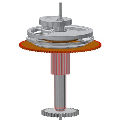 Above is the vertical clutch system, plus the fourth wheel. The actual fourth wheel is outlined in red, and turns constantly; the two fourth wheels are geared to a single escape wheel.