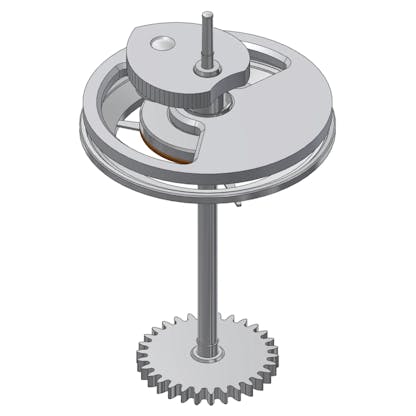 Zoom InIntermediate driving wheel for the minute counter; the wheel is driven by the vertical clutch under the cock at the bottom of the image, and drives the minute wheel from its pinion.