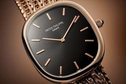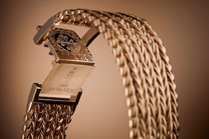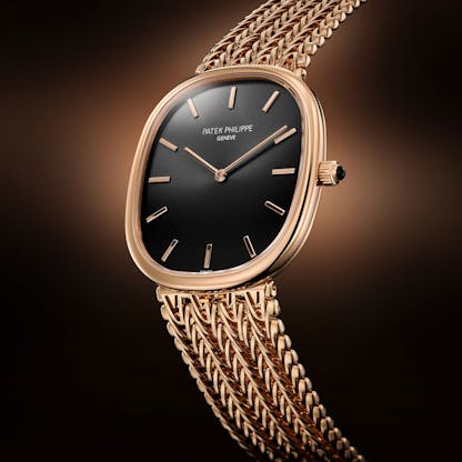 The Patek Philippe ref. 5738/1R-001: case, 39.5 x 34.5mm x 5.9mm, rose gold, with fully polished rose gold chain-style bracelet with 363 elements total; more than 300 links mounted by hand. Engraved fold-over clasp with three adjustment positions. Movement, self winding caliber 240, 27.5mm x 2.53mm, running in 27 jewels at 21,600 vph; power reserve, 48 hourse. Spiromax balance spring; 22k gold minirotor. Price, $51,000; find out more at Patek.com