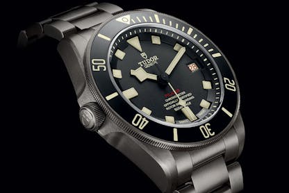 The Tudor Pelagos LHD  was announced in 2016, and the name pretty much says it all – LHD stands for “Left Hand Drive,” referring to the fact that the crown on this model is on the left side of the case. The rationale for this placement can be found in Tudor’s history of making diver’s watches for the French Navy (Marine Nationale) in the 1970s. These watches, references 9401 and 9411, had snowflake hands and conventional right-side crowns, but a few watches were modified for left-handed divers and the crown left models were meant to be worn on the right wrist of a lefty diver.