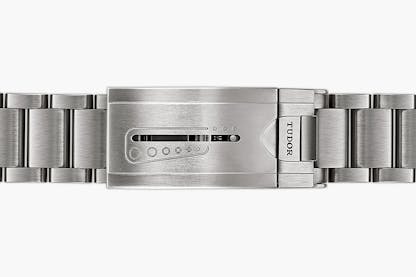This reference, 25500TN, used an ETA movement, the ETA 2824, modified by Tudor (the modifications included Tudor’s own finishing to the main plate, bridges, ratchet wheel, and screw heads, and the use of a Kif anti-shock system for balance pivots, as well as modifications to the escape wheel teeth and pallet fork to produce greater rate stability). The bracelet was a major innovation – it can be adjusted to three different positions, without tools, and the clasp has an internal, spring-loaded self-adjusting system that allows it to expand and contract while on the wrist, giving you the sturdiness of a conventional solid bracelet with the comfort of an expansion bracelet.