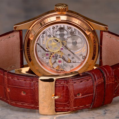 The case of the 2000 mirrors that of the original Pythagore from 1943, at 34mm but with a slightly thicker profile of 8.9mm versus 8.5mm, to make room for the additional gearing needed for the center seconds. Every example of the 2000 came with a swan’s-neck regulator, something that was merely optional on earlier Pythagore models. And then there’s the 18k gold case that sits somewhere between yellow, rose and pink gold. It was a stunning vintage recreation that hit every note a true watch collector could ask for.
