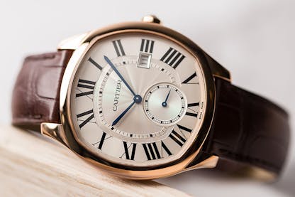 Cartier is well-known for their higher-end jewelry, but their illustrious history in watchmaking is often overlooked. The Drive is one of many dressier options that Cartier offers, and this particular piece is a 40mm rose gold Cartier Drive. While its thinness and Roman numeral hour markers lend the design to a more formal setting, the date at 3 o’clock is a practical complication to have in an everyday driver (no pun intended) as well. Cartier’s reputation for quality leather products is upheld by the included alligator strap, and the cabochon crown and blued hands demonstrate the attention to detail we’ve come to expect from Cartier.