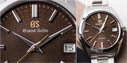 Up next is a brand that consistently punches well above its weight. As with any Grand Seiko, it only makes sense to talk first about the dial, and there is a great deal to unpack. The golden-brown comes to life in certain lights, and upon closer inspection, a mosaic pattern of “G’s” and “S’s” in the brand typeface becomes evident throughout the dial, in addition to a second s-shaped character, a reference to another older version of their logo. Sitting atop the dial of the SBGR311 are hand-finished and set, faceted hour markers and hands worthy of a loupe. The Zaratsu polishing on the dial furniture and 42mm case make this a worthy rival to its higher-end Swiss competitors. There is also a generous 100m water resistance, which makes this watch a great option as a dressier everyday piece.