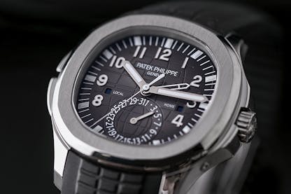 The Aquanaut is a sportier take from a company so well-known for timeless dress watches. This Aquanaut Travel Time 5164A boasts a dual time complication, which is similar to a GMT in that it allows the watch to track more than one time zone using an additional hour hand. Seamlessly integrated into the left of the case are two buttons that advance the second hour hand forward or backward. This feature makes it so easy to change the secondary time as you travel between time zones. The dual time complication coupled with the wearable 41mm case, durable rubber strap, and more-than-sufficient 120m water resistance really does make this watch an ideal traveling companion and certainly earns its title as the “Travel Time.”
