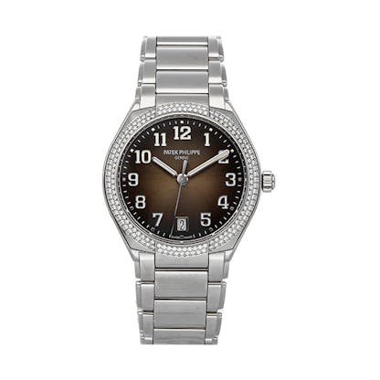 Patek Philippe takes the iconic Nautilus combined with precious metals and a gem set bezel to create an equally iconic ladies watch in the reference 7010. The watch is produced in white gold or rose gold, is powered by the quartz Caliber E 23-250, and measures 32mm.