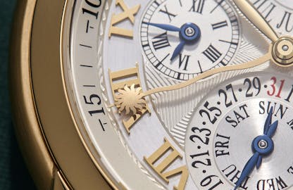 The times for sunrise and sunset are shown on subdials to the left and right – the actual time the Sun rises and sets varies with latitude (think, for instance, of how long the winter night is in the Arctic, versus New York; in New York the difference between the times of sunrise and sunset can be as much as four hours). These times can also be encoded on rotating cams – the Jules Audemars Equation Of Time was, again, not the first wristwatch to show sunrise and sunset times, nor the first watch (the famous Henry Graves Supercomplication, for instance, showed times of sunrise and sunset in New York) but it was the first wristwatch to show those times clearly, and legibly, with to the minute precision; it would be followed just a few months later by the Eos watch, designed by Martin Braun.
