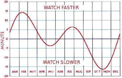 So why do watch and clockmakers care about the Equation Of Time? Suppose you have a clock with a seconds pendulum, which beats 86,400 times per day – that’s a mean solar day. Now, suppose you want to set the clock from a sundial you have in your garden (this scenario also presumes you have a country estate and generational wealth). However, to do so, you need to know what the Equation Of Time is for the date on which you want to set your clock. You can then go ahead and set your clock by the sundial, and then add or subtract whatever the Equation Of Time is for that day, and you will then have a clock that tells the mean solar time for your location. And in fact, many longcase pendulum clocks used to have Equation Of Time tables pasted into the backs of their cabinets.