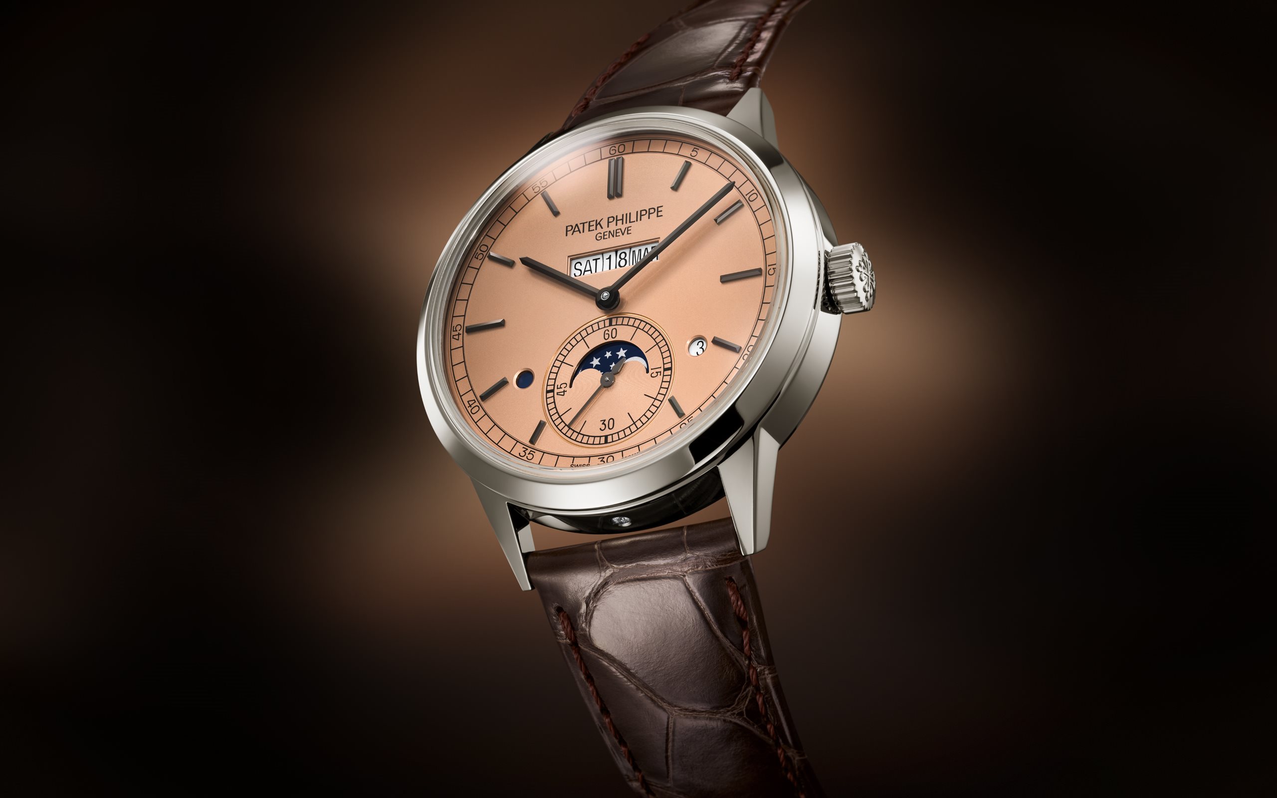 The new dial, described as “rose-gilt opaline” by Patek Philippe, boasts a warm, salmon-inspired hue. As it’s been stated before I truly believe everyone needs a salmon dial in their collection. White gold hands and applied faceted baton markers are finished in dark gray charcoal, while dial printing and text are executed in black. The day, date, and month are displayed in a linear format at 12 o’clock, with the moonphase display and running seconds occupying the lower half of the dial. Two small circular apertures flank the moonphase display, with the left-hand side indicating day/night and the right-hand side tracking the leap year cycle.