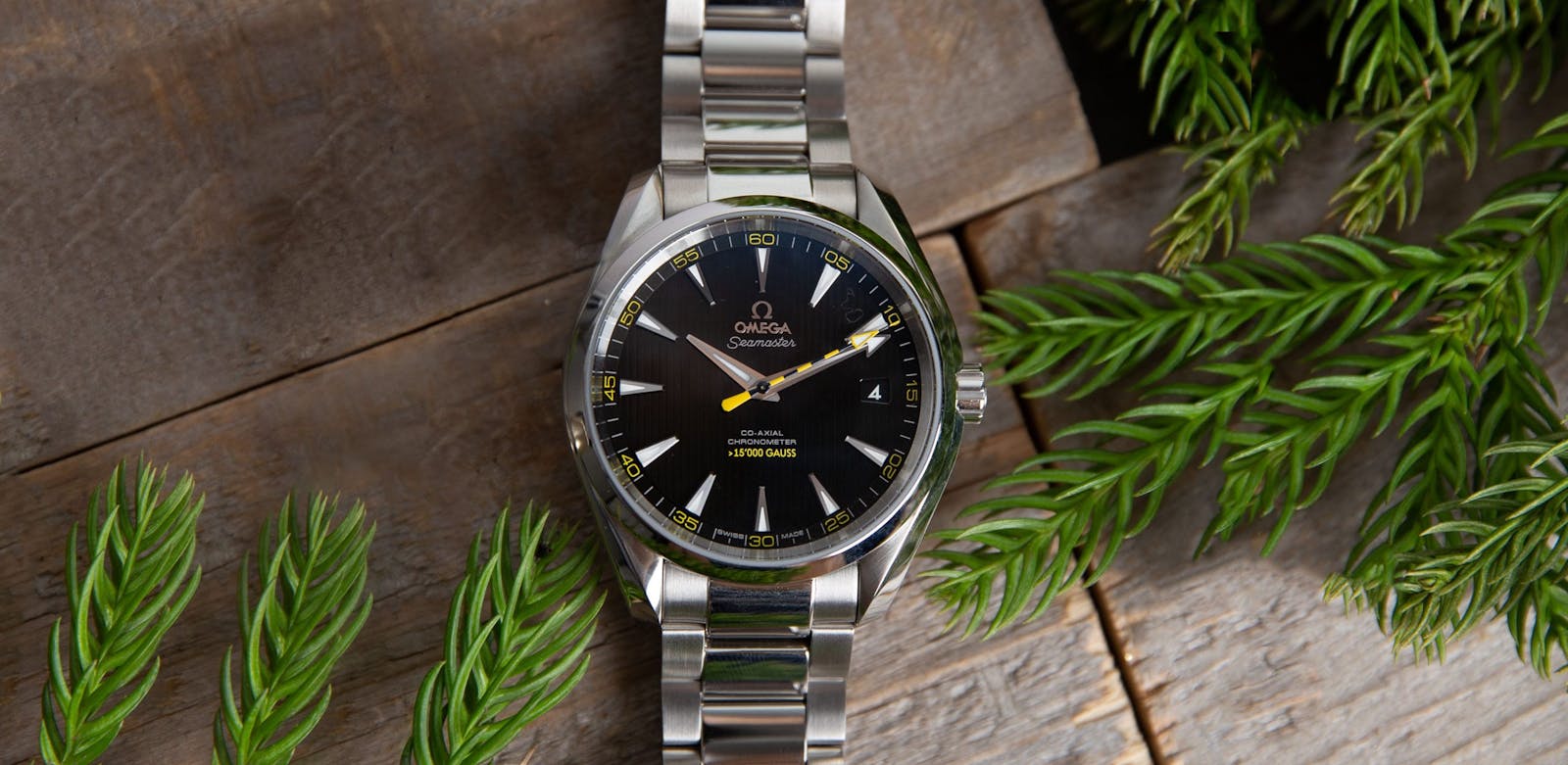 The Aqua Terra models feature some version of Omega’s in-house 8500 caliber, which offers a handy hour-jumping feature that allows the hour hand to be moved forward or backwards independently without stopping the seconds hand. This is perfect if your career requires frequent travel between time zones! As a reminder that this watch is in the Seamaster family, the Aqua Terra case features the signature twisted lugs which add an element of flare on the wrist. The Aqua Terra we have featured here has a 41.5mm case and a bi-color black and yellow second hand which hearkens back to the scientific roots of the model. The Aqua Terra is the one to have if you’re after the one “all-arounder.”