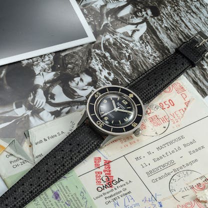 What takes this particular Fifty Fathoms a few more leagues under the sea is the fact that it isn’t just any vintage variant, this one comes with a story. In 1957, Blancpain’s CEO, Jean-Jacques Fiechter — a diver himself — was instructing an amateur diver, Mr. Matthouse, off the coast of the South of France. As the story goes, Mr. Matthouse wasn’t wearing a dive watch, so Fiechter offered to sell him one. The amateur agreed, and the watch he bought at “factory price” is this watch, now up for auction. This isn’t just any Fifty Fathoms, it’s one sold directly by the man who invented the damn thing.