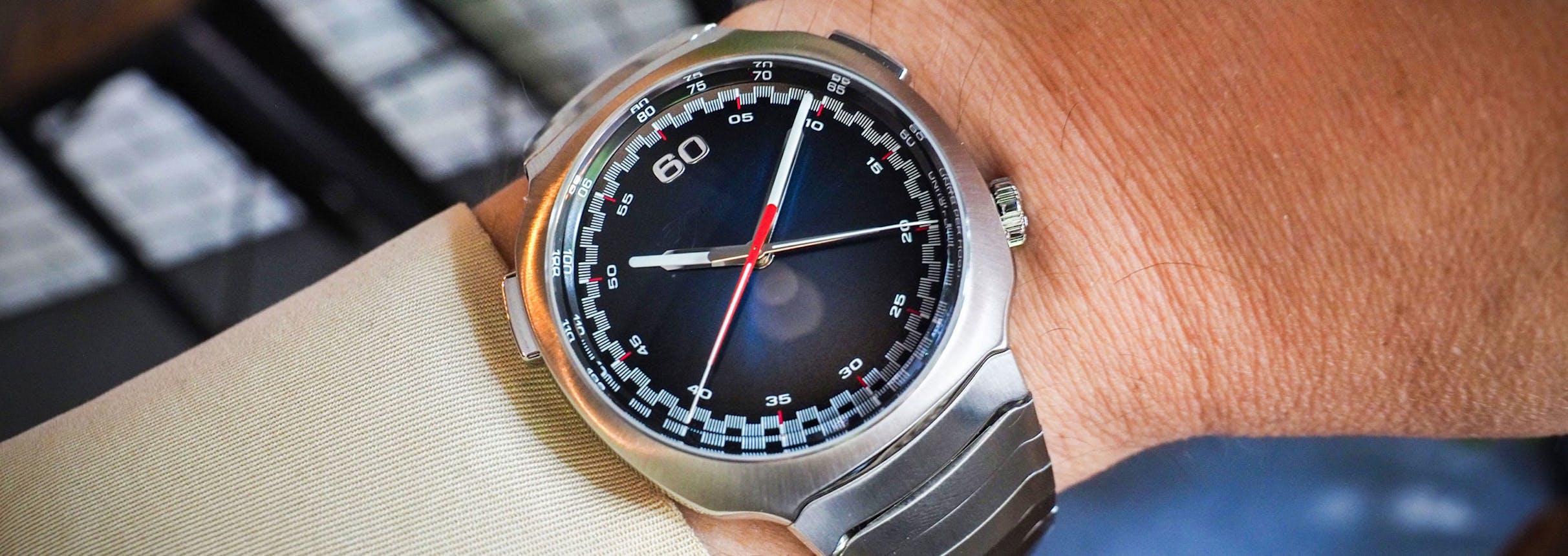 The integrated bracelet really impresses in person – it has a quality of almost organic articulation, and the critical transition between the case proper and the bracelet is handled beautifully, with a bevel at the lug echoing the polished transitions between each link.