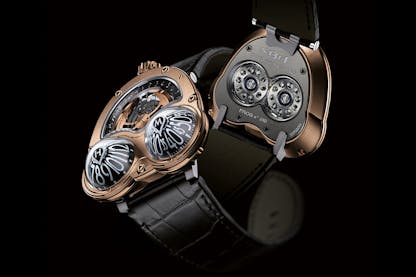 The first MB&F watch that I ever saw in person was HM2, in 2008 – I had lunch with Max at the Museum Of Modern Art (an apt location) and I was floored. HM2 is an ingot of gold with instantaneous jumping hours, concentric retrograde minutes, retrograde date, bi-hemisphere moon-phase and automatic winding, on a manga-battleaxe shaped central rotor, built on a base caliber from Girard-Perregaux.