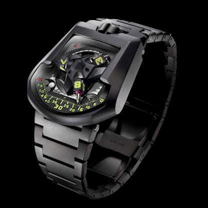 A quite dramatically different take on the wandering hours display is from URWERK, who have built their entire brand around the wandering hours display and variations on the original design. The UR-202 for instance, is technically a wandering hours display but with some major design and technical differences when compared to a traditional version like the Star Wheel. One notable technical difference is that the satellites in the URWERK design are not disks, but rather, rotating cubes.