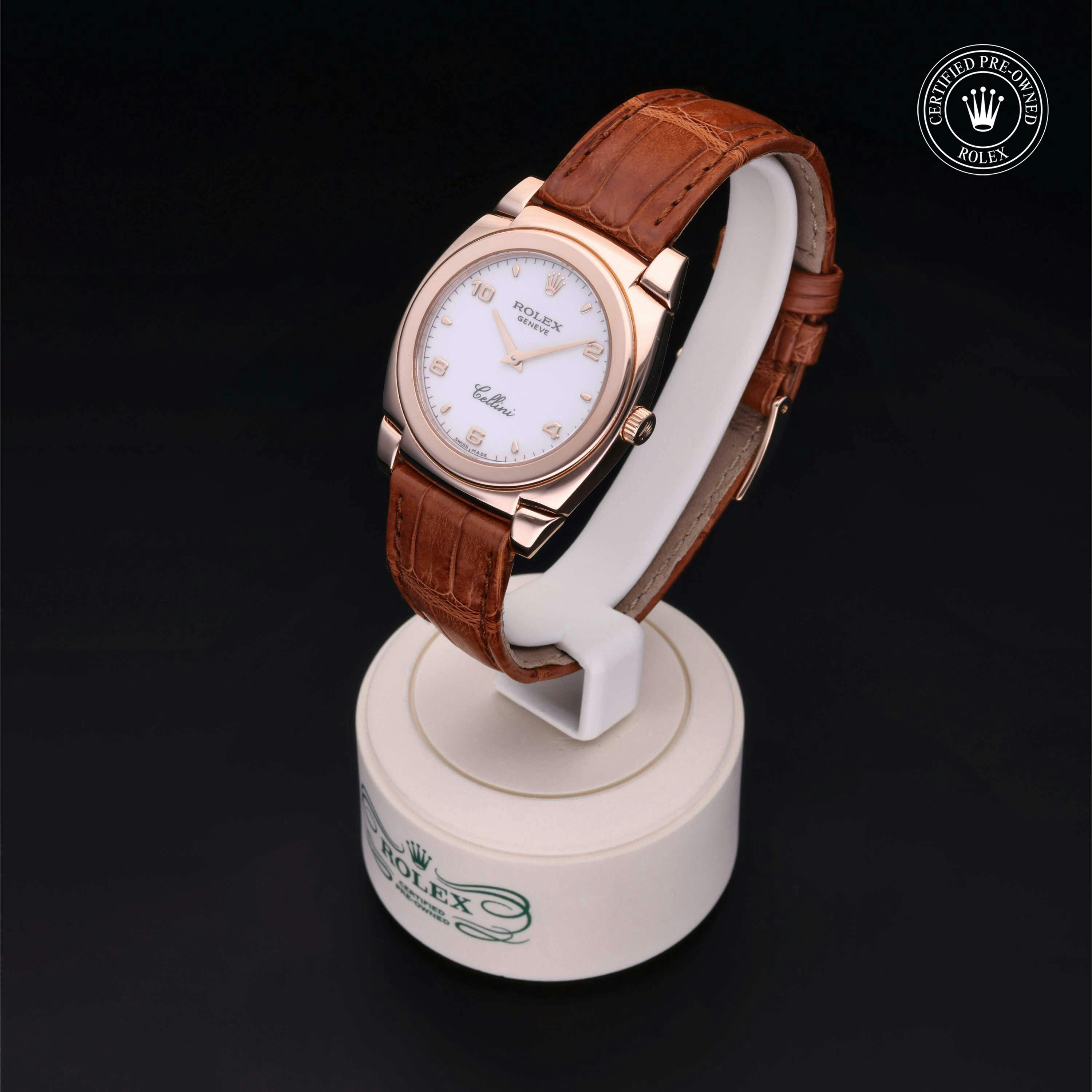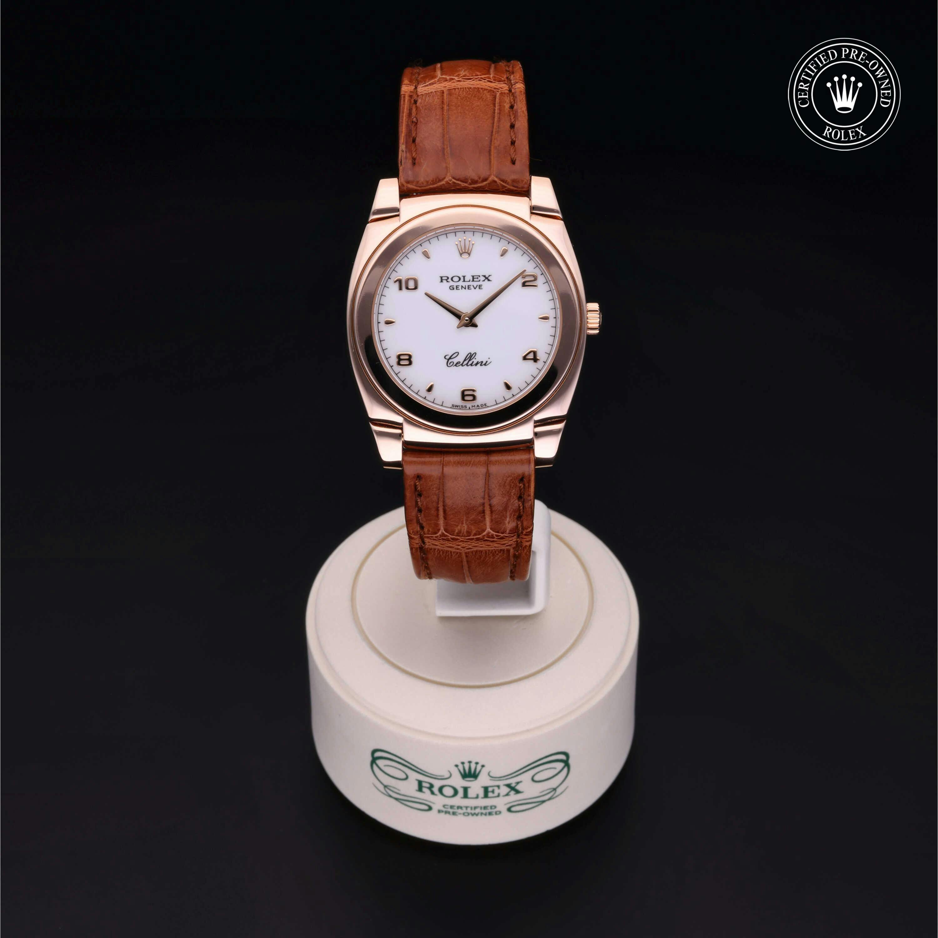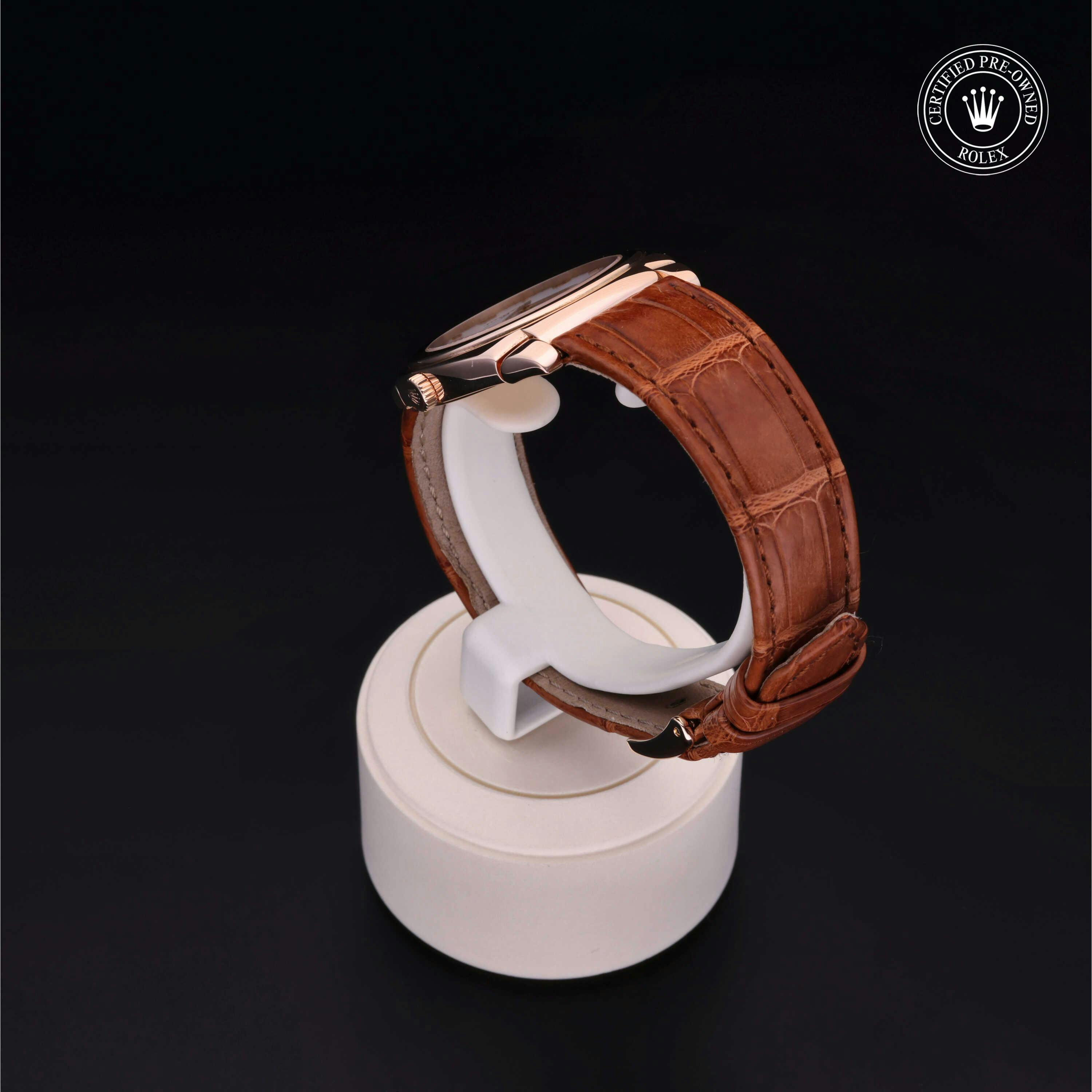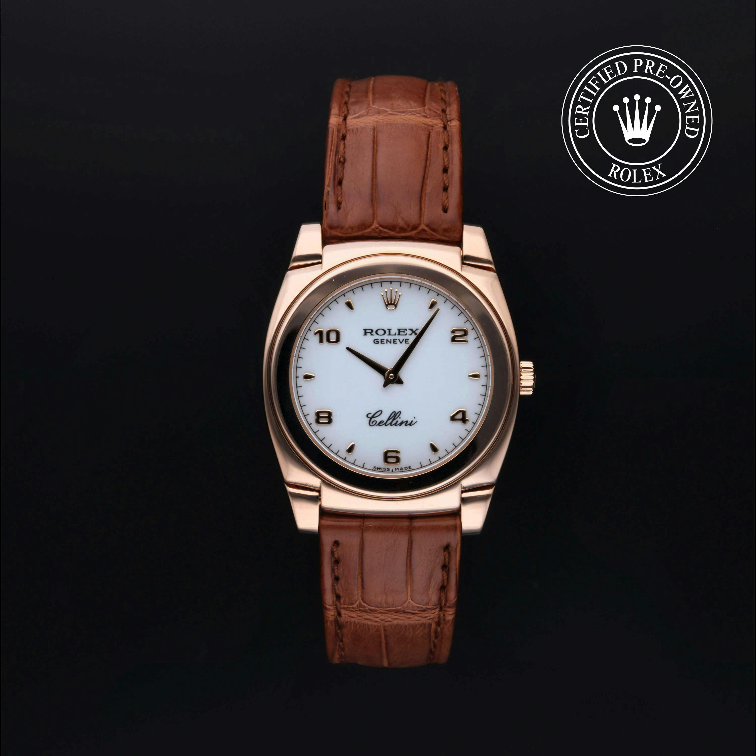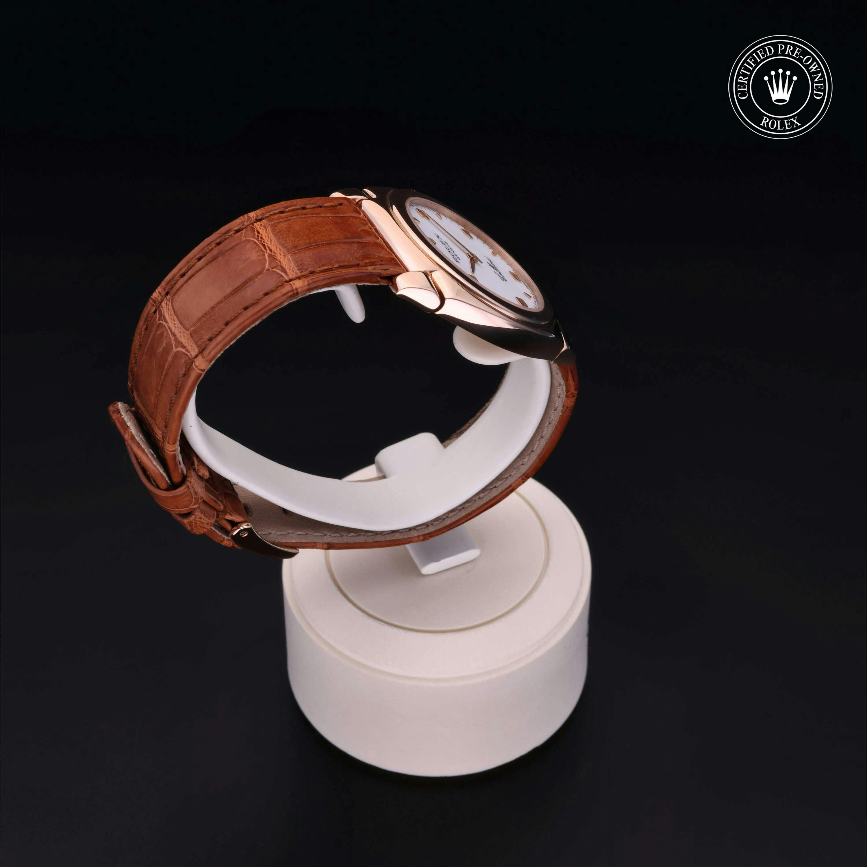 Rolex Certified Pre-Owned Cellini (5320) manual wind watch, features a 32mm 18k rose gold case surrounding a white dial. The watch is paired on a brown alligator strap and is secured with an 18k rose gold tang buckle. Functions include hours and minutes. This watch has been serviced by an authorized service center and certified by Rolex. It does not come with the original box or papers, but includes a custom Rolex Certified Pre-Owned hang tag, travel pouch and international warranty card.