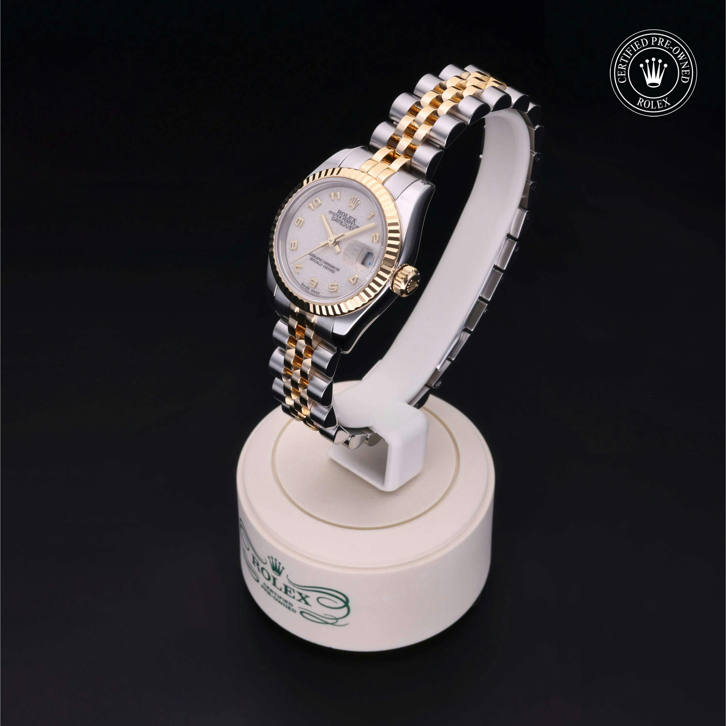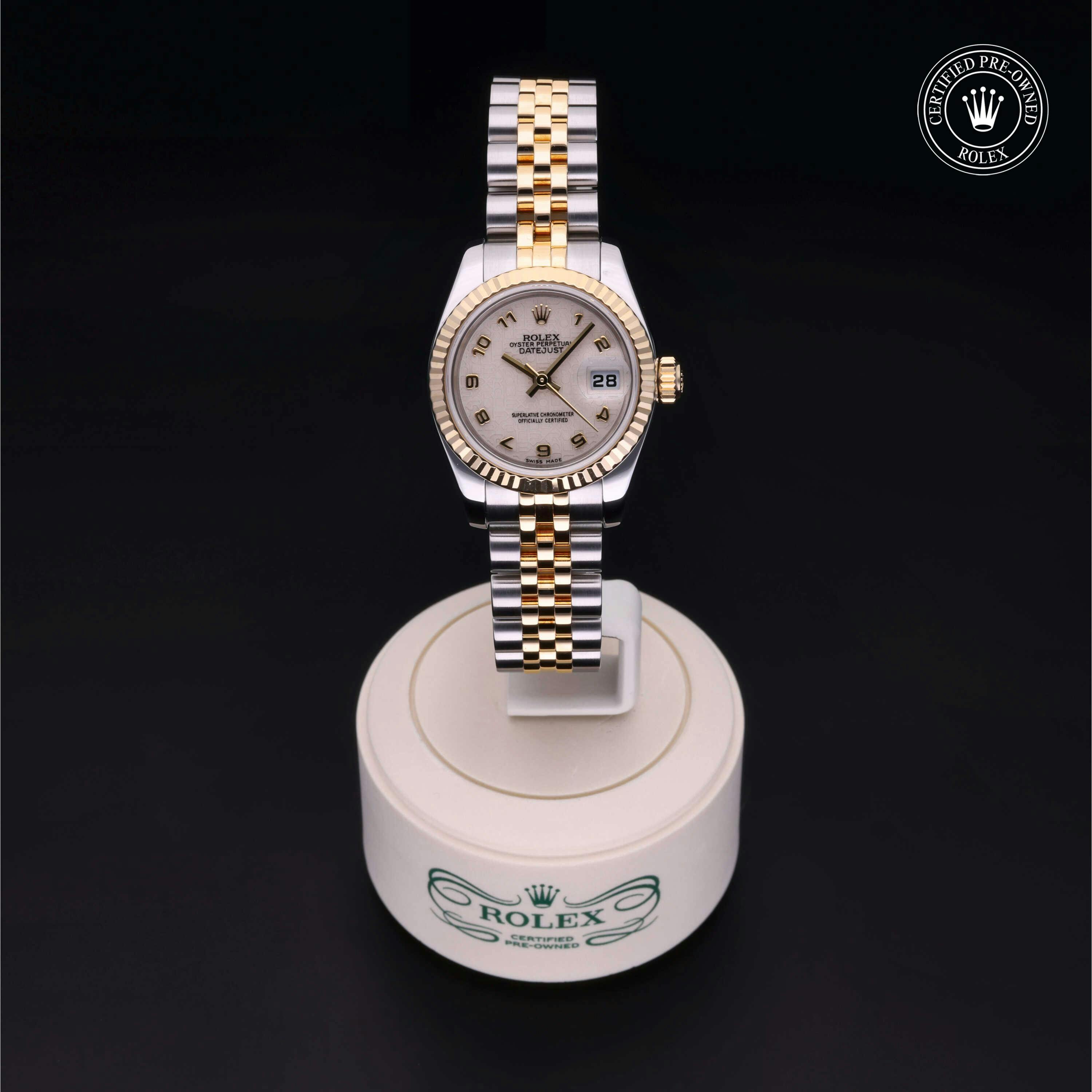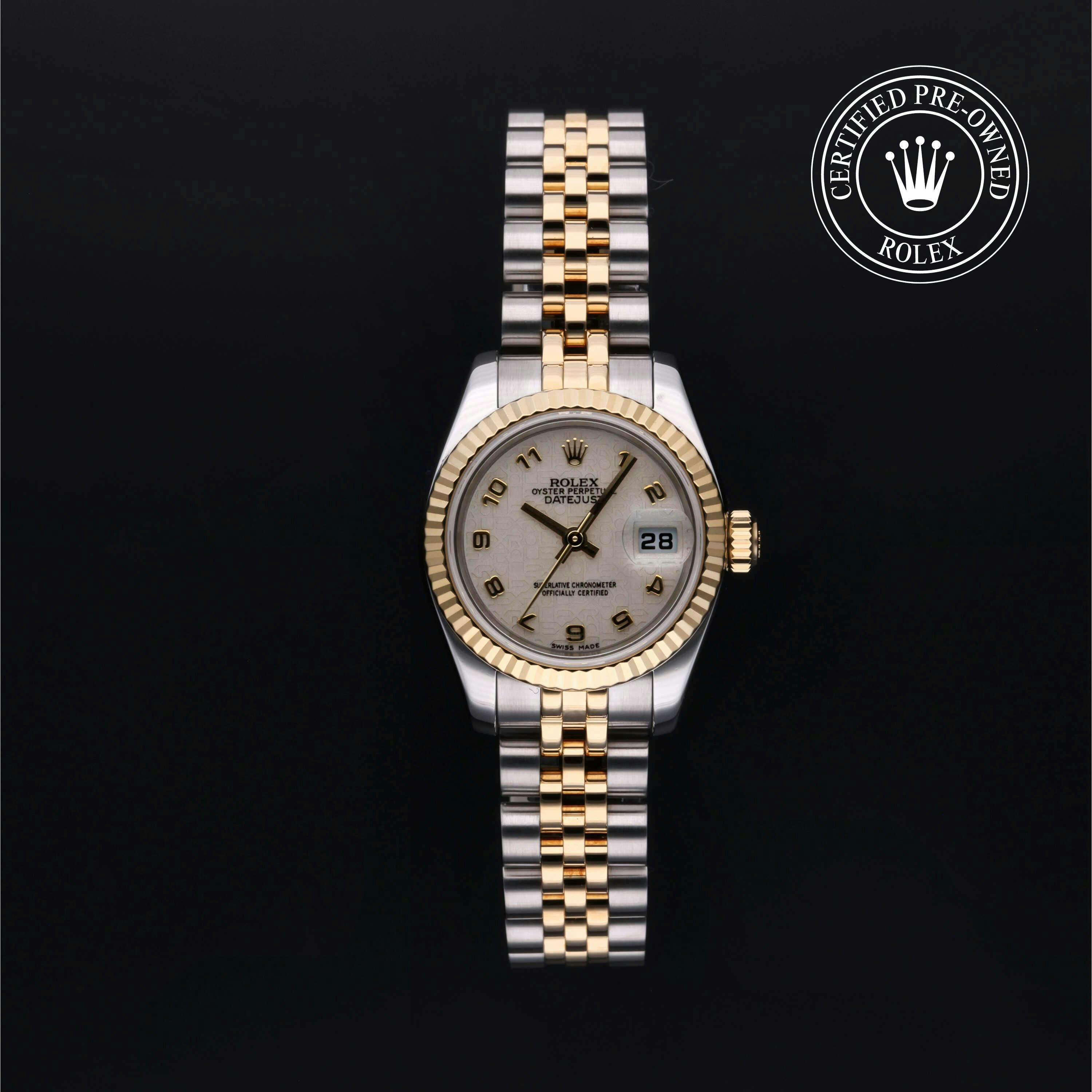 Rolex Certified Pre-Owned Datejust (179173) self - winding automatic watch, features a 26mm stainless steel case with an 18k yellow gold fluted bezel surrounding an ivory Jubilee patern dial. The watch is secured on stainless steel and 18k yellow gold Jubilee bracelet complete with a folding buckle. Functions include hours, minutes, seconds and date. This watch has been serviced by an authorized service center and certified by Rolex. It does not come with the original box or papers, but includes a custom Rolex Certified Pre-Owned hang tag, travel pouch and international warranty card.
