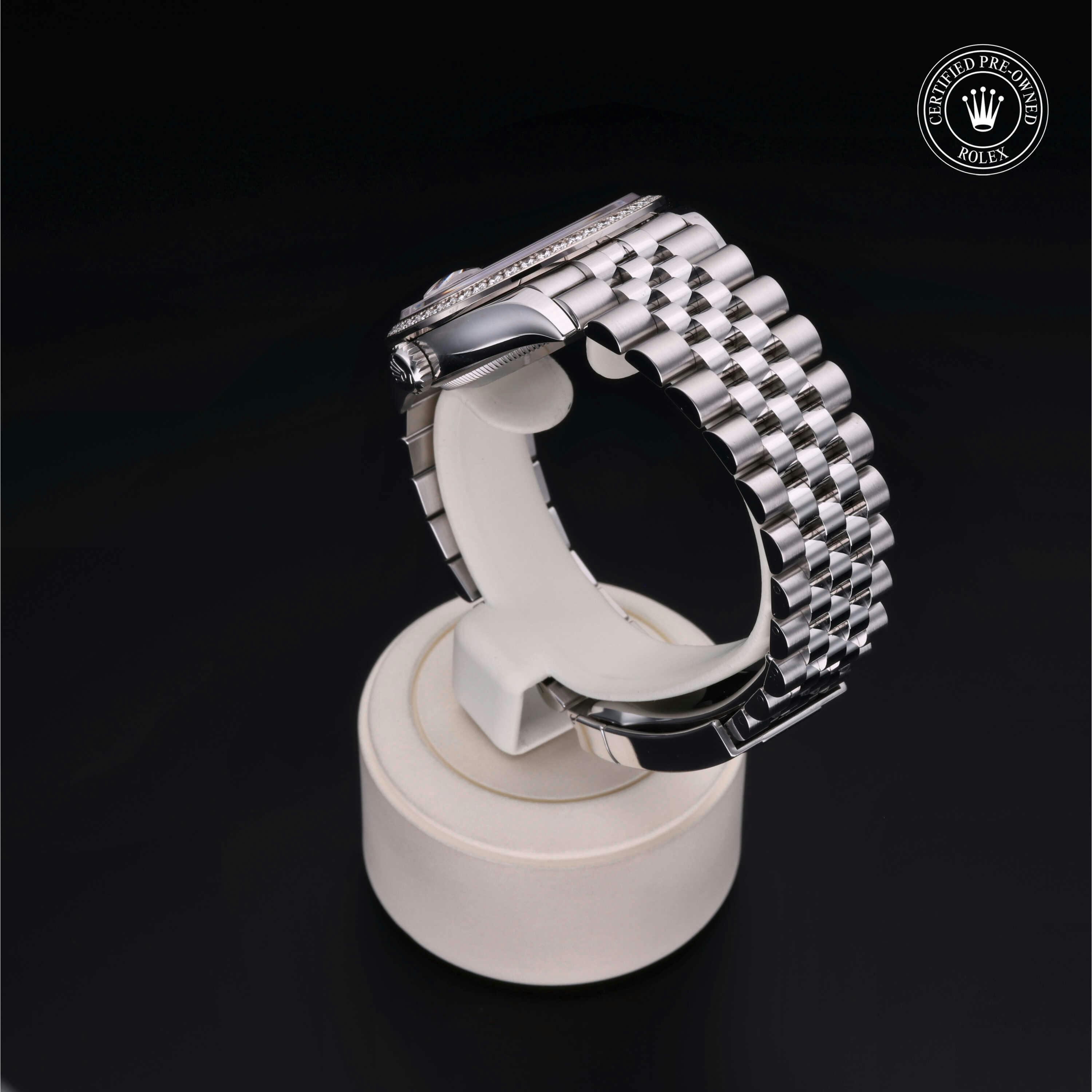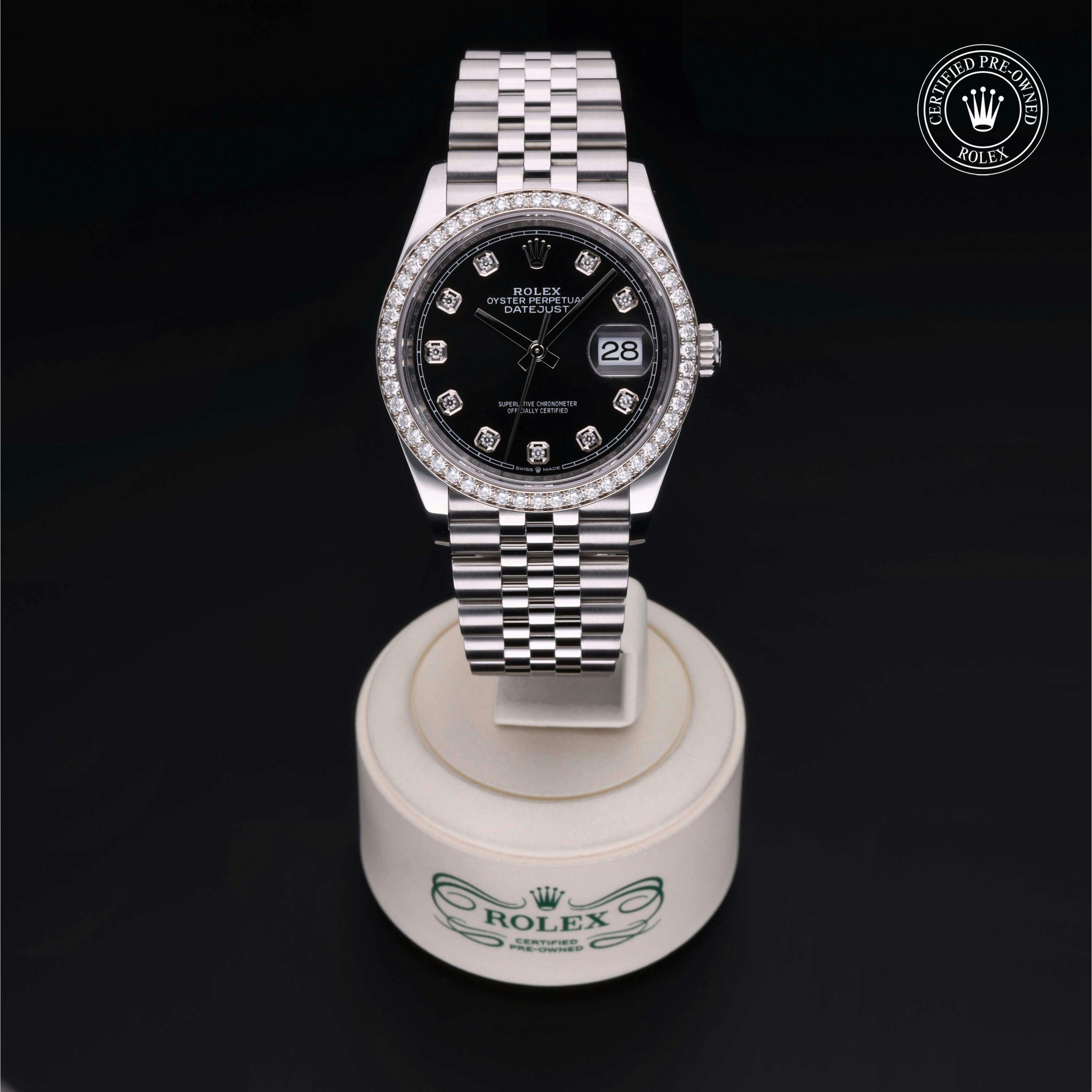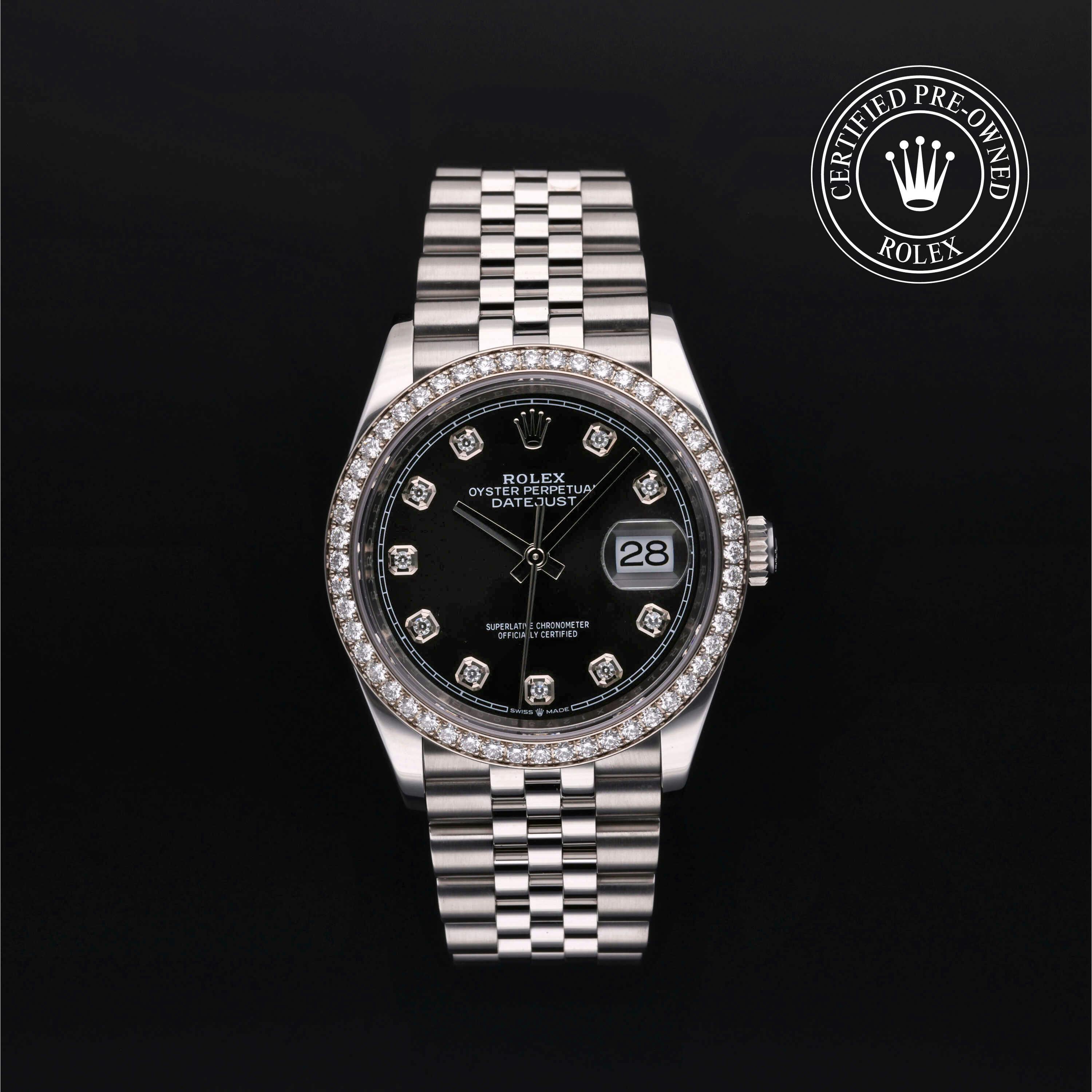 Rolex Certified Pre-Owned Datejust (126284RBR) self - winding automatic watch, features a 36mm stainless steel case with an 18k white gold diamond set bezel surrounding a bright black diamond set dial on a stainless steel jubilee bracelet. Functions include hours, minutes, seconds and date. This watch has received Rolex-authorized service and certification. It comes with the original box and papers, and includes a custom Rolex Certified Pre-Owned hang tag, travel pouch and RCPO international warranty card.